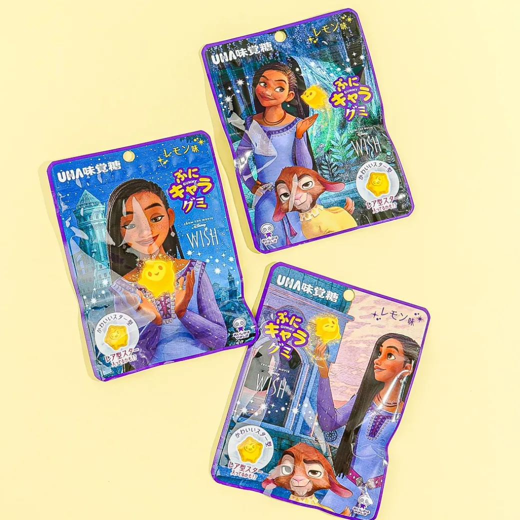 Star from Wish has turned into a delicious lemon-flavored gummy. Enjoy chewing on this pack of yummy gummy candies featuring prints of characters from the Disney movie, Wish! Surprise yourself with a random package design from a set of 3 when you order.