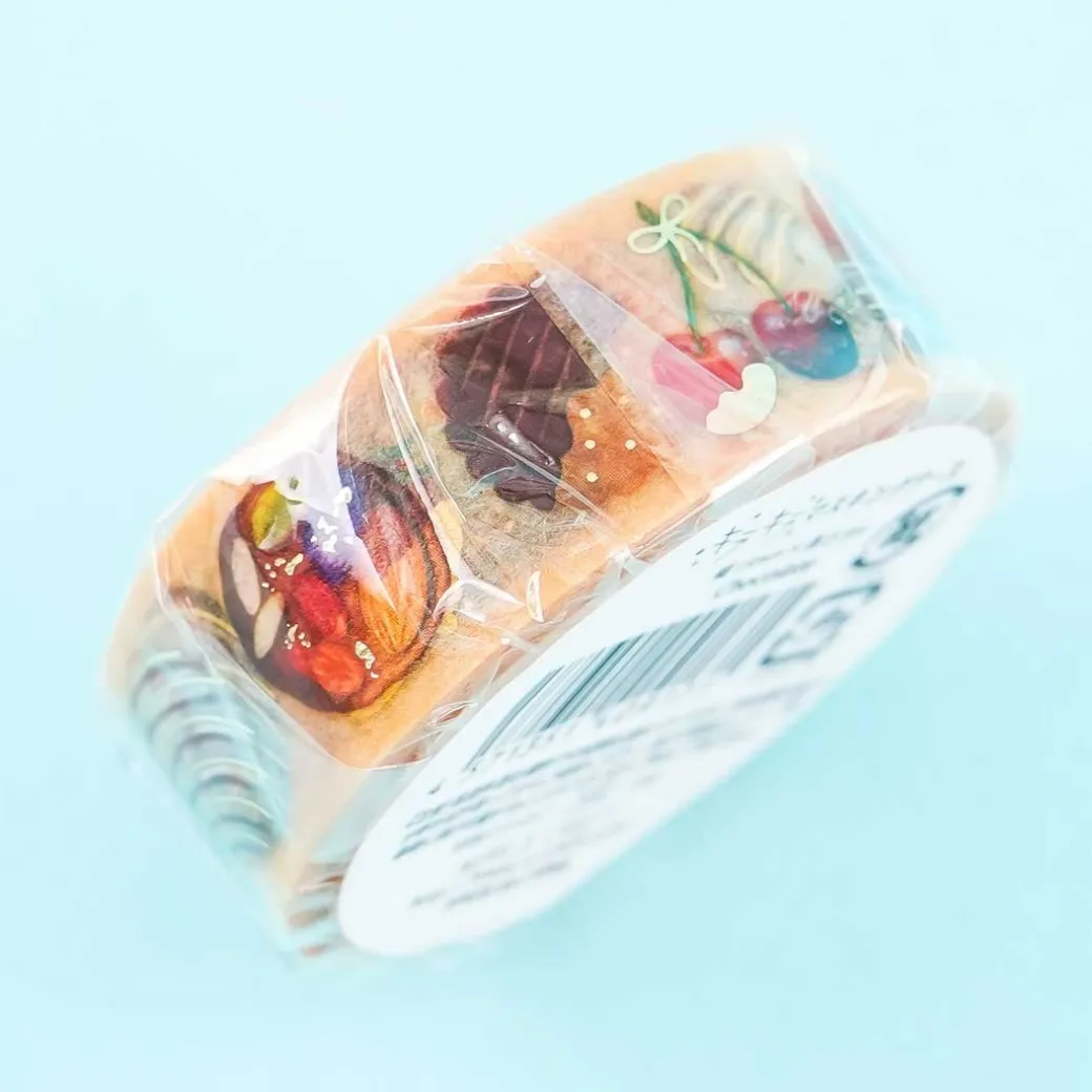 - A kawaii roll of masking tape illustrated with different kinds of chocolates