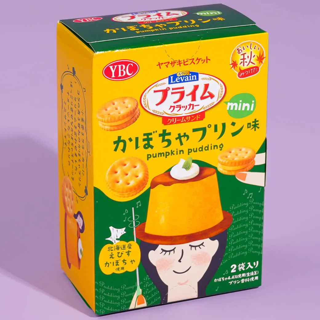 Fill your tummy with this delicious autumn-inspired snack! It features a pumpkin pudding-flavored cream between savory Prime biscuits. This mini snack also has a slight caramel flavor for added sweetness!